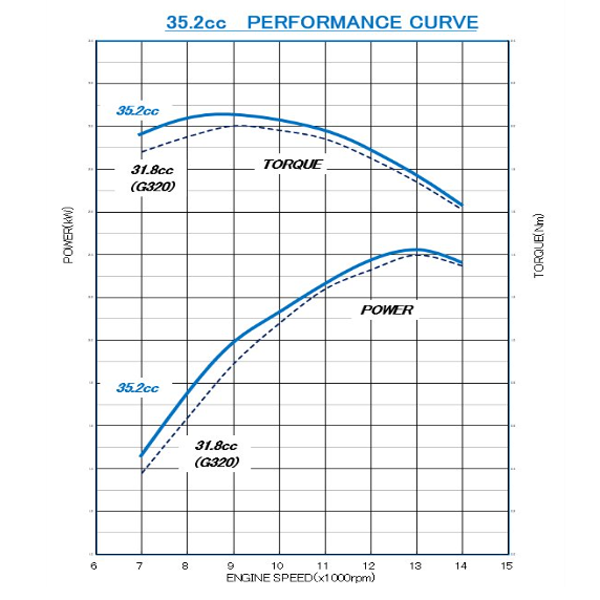 A performance curve comparing the standard 31.8cc (G320) specification and the 35.2cc bore-up configuration is provided separately.